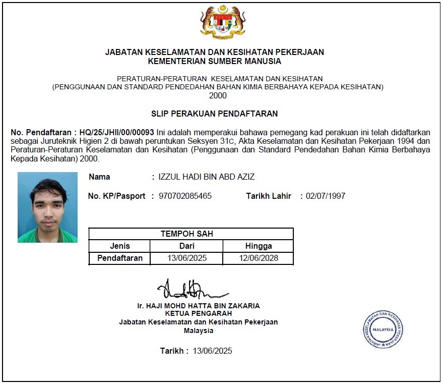 DOSH Hygiene Technician II Certificate